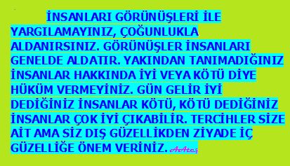 İNSANLARI GÖRÜNÜŞLERİ İLE YARGILAMAYINIZ, ÇOĞUNLUKLA ALDANIRSINIZ. GÖRÜNÜŞLER İNSANLARI GENELDE ALDATIR. YAKINDAN TANIMADIĞINIZ İNSANLAR HAKKINDA İYİ VEYA KÖTÜ DİYE HÜKÜM VERMEYİNİZ. GÜN GELİR İYİ DEDİĞİNİZ İNSANLAR KÖTÜ, KÖTÜ DEDİĞİNİZ İNSANLAR ÇOK İYİ ÇIKABİLİR. TERCİHLER SİZE AİT AMA SİZ DIŞ GÜZELLİKDEN ZİYADE İÇ GÜZELLİĞE ÖNEM VERİNİZ. AAteş