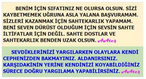 BENİM İÇİN SIFATINIZ NE OLURSA OLSUN. SİZİ KAYBETMEMEK UĞRUNA ASLA YALANA BAŞVURAMAM. SİZLERİ KAZANMAK İÇİN SAHTEKARLIK YAPAMAM. BENİ SEVEN DÜRÜST OLDUĞUM İÇİN SEVSİN SAHTE İLTİFATLAR İÇİN DEĞİL. SAHTE DOSTLAR VE SAHTEKARLIK BENDEN UZAK OLSUN. AAteş