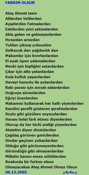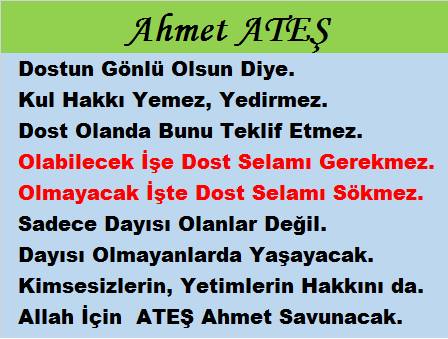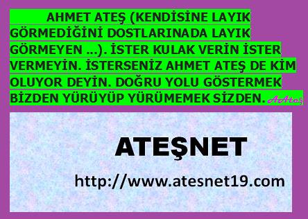 AHMET ATEŞ (KENDİSİNE LAYIK GÖRMEDİĞİNİ DOSTLARINADA LAYIK GÖRMEYEN ...). İSTER KULAK VERİN İSTER VERMEYİN. İSTERSENİZ AHMET ATEŞ DE KİM OLUYOR DEYİN. DOĞRU YOLU GÖSTERMEK BİZDEN YÜRÜYÜP YÜRÜMEMEK SİZDEN. Ateş
