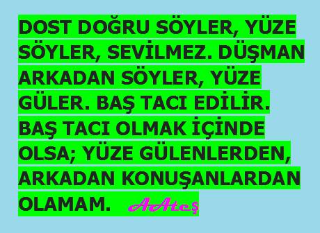 DOST DOĞRU SÖYLER, YÜZE SÖYLER, SEVİLMEZ. DÜŞMAN ARKADAN SÖYLER, YÜZE GÜLER. BAŞ TACI EDİLİR. BAŞ TACI OLMAK İÇİNDE OLSA; YÜZE GÜLENLERDEN, ARKADAN KONUŞANLARDAN OLAMAM. AAteş