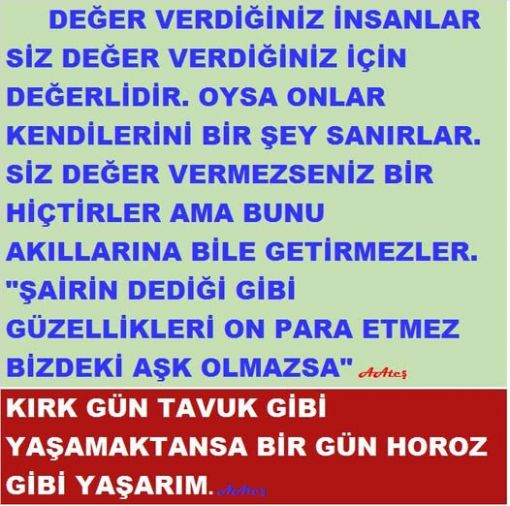 İSTER ARKADAŞINIZ, İSTER SEVGİLİNİZ, İSTER AÇIK İSTER GİZLİ AŞKINIZ, İSTER DOSTUNUZ, İSTER SIRDAŞINIZ, İSTER ANNE BABANIZ, DEĞER VERDİĞİNİZ KİM OLURSA OLSUN GEREĞİNDEN FAZLA DEĞER VERMEYİNİZ. KENDİ DEĞERİNİZDEN KAYBEDERSİNİZ. AAteş