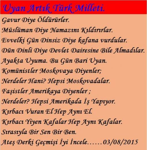 AHMET ATEŞ (KENDİSİNE LAYIK GÖRMEDİĞİNİ DOSTLARINADA LAYIK GÖRMEYEN ...). İSTER KULAK VERİN İSTER VERMEYİN. İSTERSENİZ AHMET ATEŞ DE KİM OLUYOR DEYİN. DOĞRU YOLU GÖSTERMEK BİZDEN YÜRÜYÜP YÜRÜMEMEK SİZDEN. AAteş