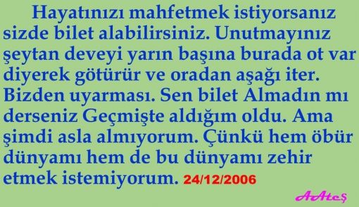 Hayatınızı maffetmek istiyorsanız sizde bilet alabilirsiniz. Unutmayınız şeytan deveyi yarın başına burada ot var diyerek götürür ve oradan aşağı iter. Bizden uyarması. Sen bilet Almadın mı derseniz Geçmişte aldığım oldu. Ama şimdi asla almıyorum. Çünkü hem öbür dünyamı hemde bu dünyamı zehir etmek istemiyorum.AAteş